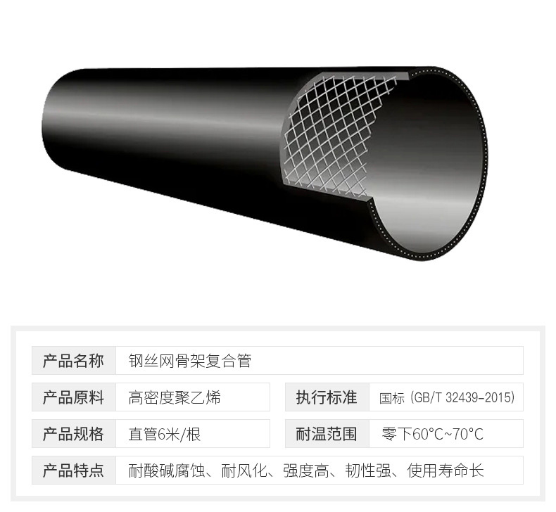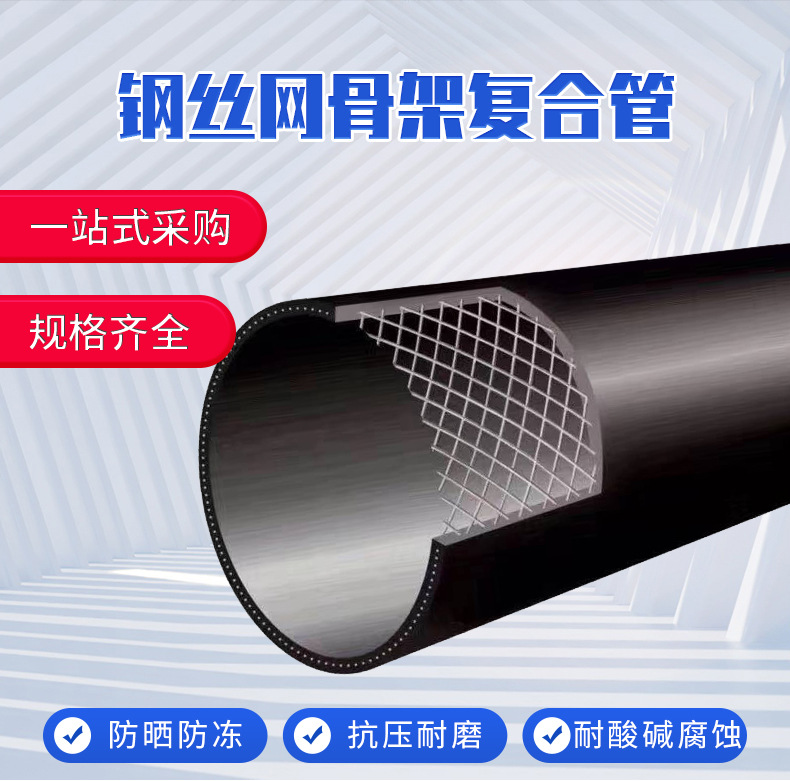 PE鋼絲網(wǎng)骨架塑料復(fù)合管是以高強(qiáng)度鋼絲和聚乙烯塑料為原材料,以纏繞成型的高繩度鋼絲為芯層,以高密度聚乙烯塑料為內(nèi)、外層 ,形成整體管壁的一種新型復(fù)合結(jié)構(gòu)管材。復(fù)合管加入鋼絲增強(qiáng)網(wǎng),不但在管材耐壓能力上比PE實(shí)壁管有了很大的提高,同時(shí)還保留了PE實(shí)壁管優(yōu)異的耐腐蝕性、無水垢等特點(diǎn)。其增強(qiáng)體被包覆在連續(xù)熱熔性塑料之中,保證了鋼絲與外界的隔離,使得鋼絲的使用壽命更長(zhǎng)久,保證管材長(zhǎng)久的耐幫性能。